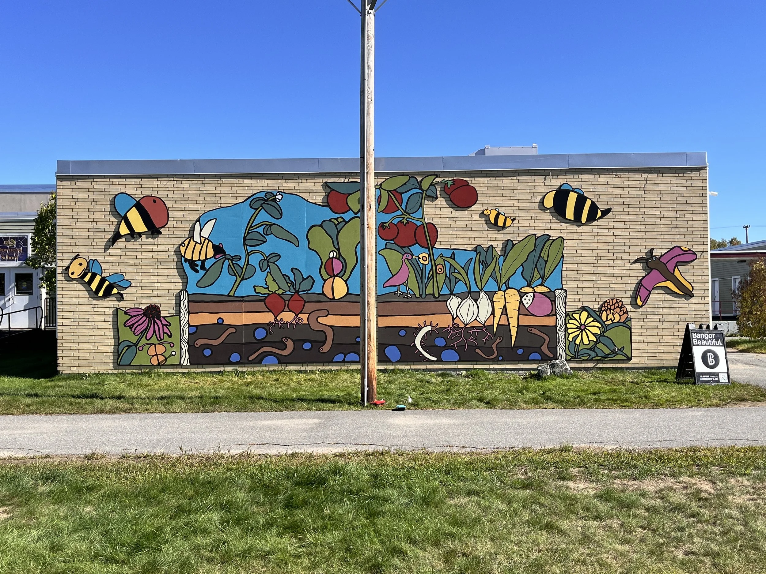 A second successful collaborative mural with DownEast Elementary School in Bangor, Maine. This Time we focused on the vegetable gardens as well as pollinators with over 300 kids participating with the backing of Bangor Beautiful and an endless supply of volunteers from the community and DownEast School.